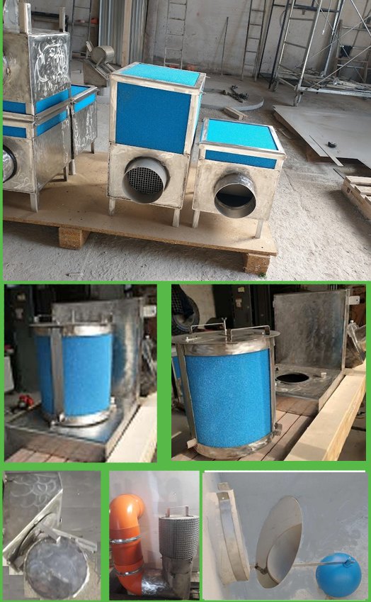 Il filtro a coalescenza è realizzato con struttura portante in acciaio AISI 304 o, a richiesta, 316 ed ha le dimensioni esterne variabili, mentre la parte filtrante è costituita da materiale a base di poliestere con struttura da 20 a 60 ppi in grado di far coalescere i liquidi leggeri presenti in acqua.