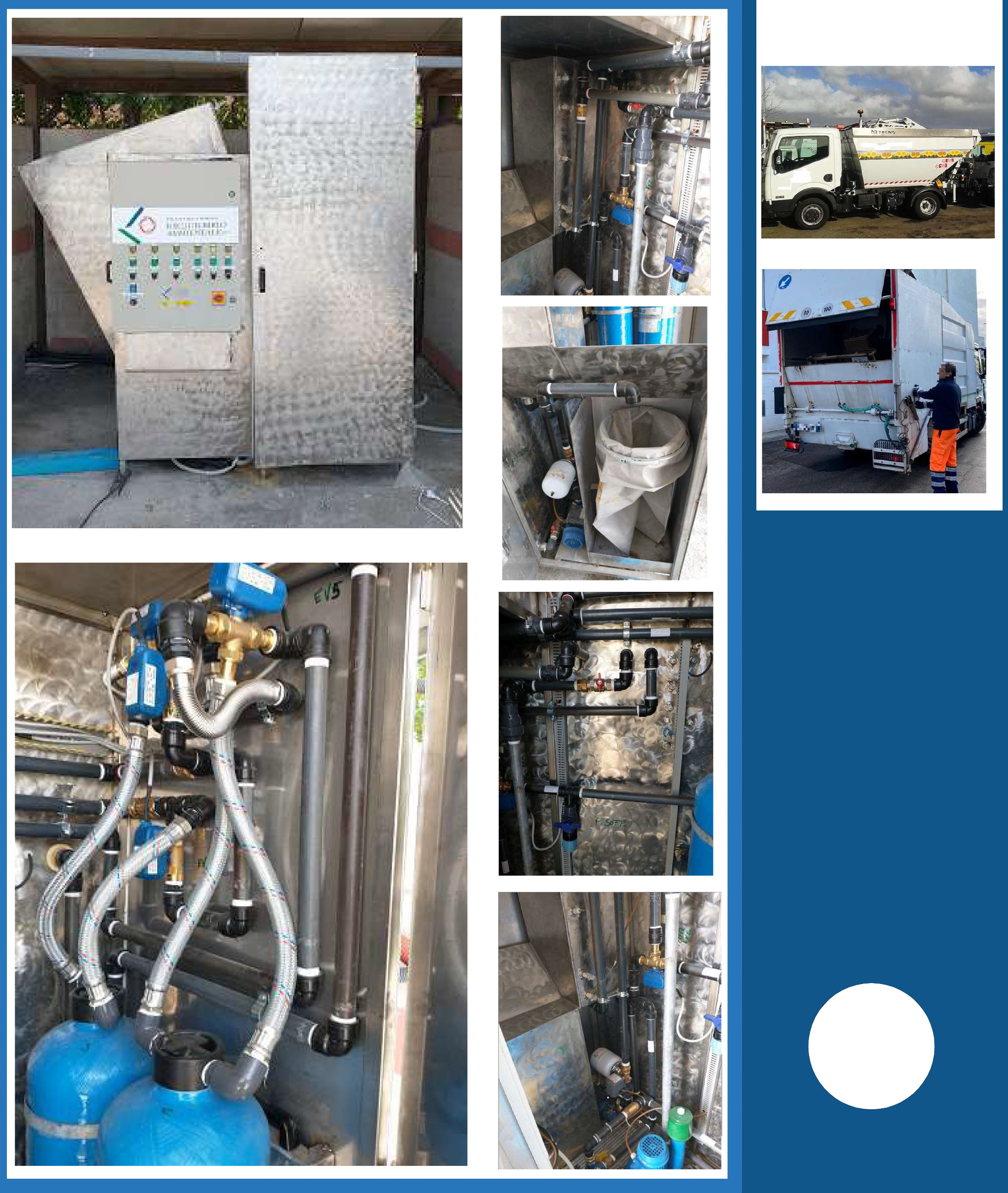 Una pompa di sollevamento trasferirà le acque da trattare all’interno di vari settori realizzati in acciaio inox AISI 316. Il primo settore prevede un accumulo con sfioro realizzato con passaggio su filtrazione in poliuterano per bloccare eventuali liquidi leggeri. In questo settore avviene il controllo del pH delle acque da trattare.
