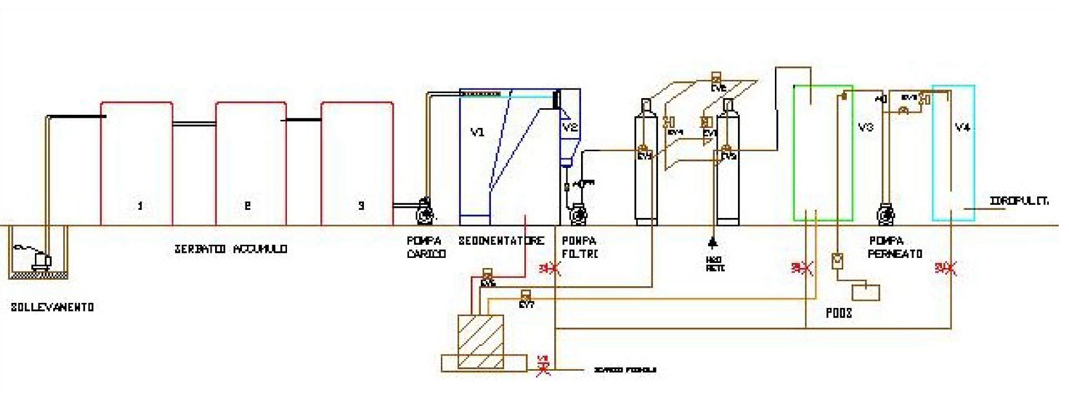 Dallo sfioro, tramite pompa di sollevamento, le acque vengono filtrate su serbatoi di quarzite e carboni attivi ed infine immesse nel biologico con MBR. Le acque così trattate possono essere parzialmente riutilizzate o scaricate con valori di cui alla Tab. IV.