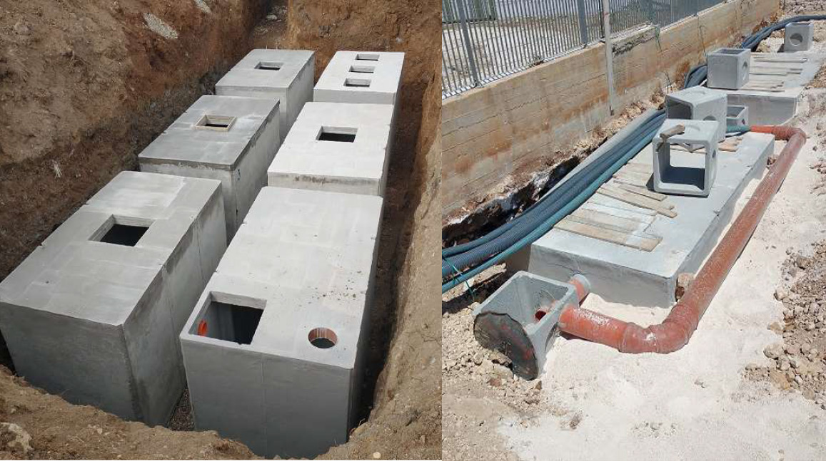 Pozzetto scolmatore realizzato con fori d’ingresso, di uscita e foro di by-pass con tubi in PVC inclusi nel getto a sigillare ermeticamente i collegamenti.